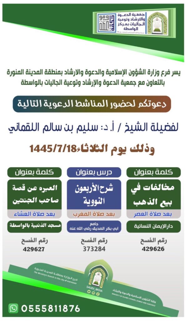 دعوة لحضور مناشط دعوية للشيخ سليم بن سالم اللقماني يوم الثلاثاء 18-7-1445